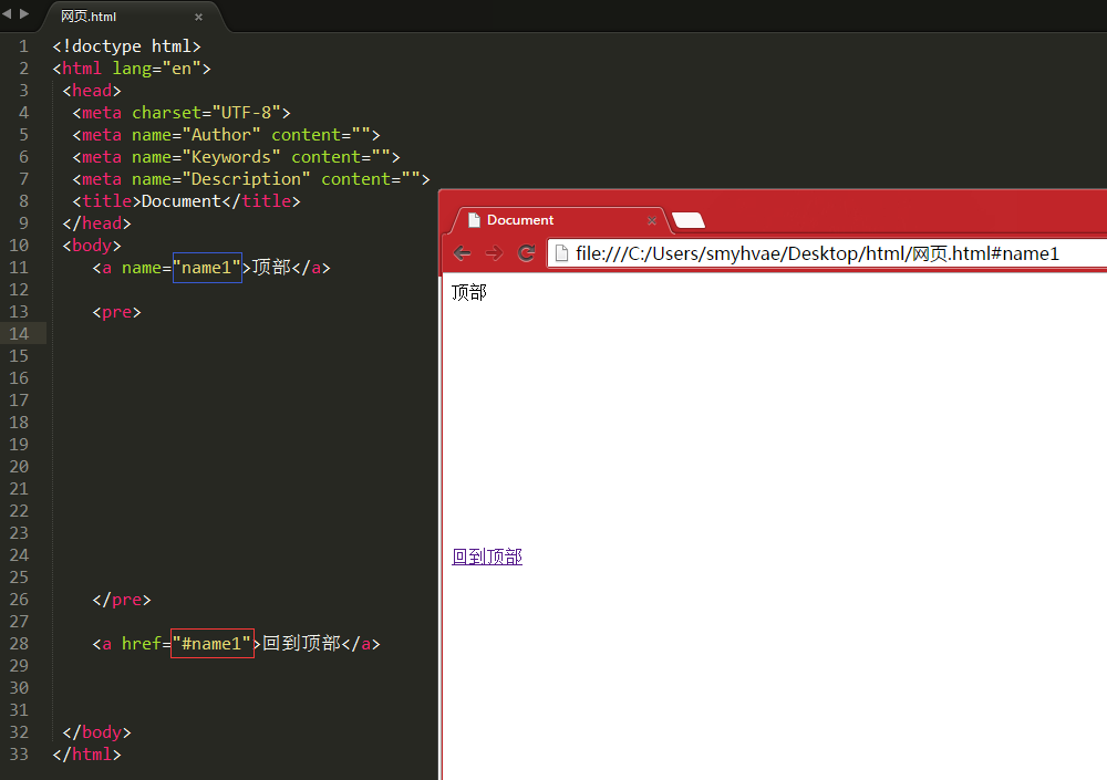 11行代码表示,顶部这个锚的名字叫做name1。 然后在底部设置超链接,点击时将回到顶部(此时,网页中的url的末尾也出现了#name1)。注意上图中红框部分的#号不要忘记了,表示跳到名为name1的特定位置,这是规定。如果少了#号,点击之后,就会跳到name1这个文件或者name1这个文件夹中去。