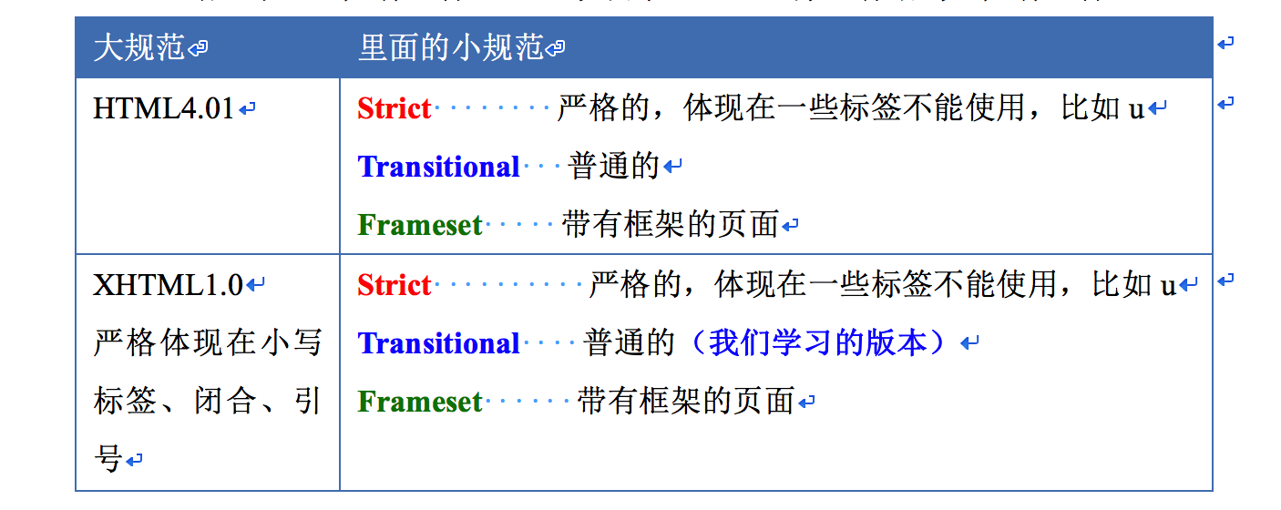 XHTML介绍: XHTML:Extensible Hypertext Markup Language,可扩展超文本标注语言。 XHTML的主要目的是为了取代HTML,也可以理解为HTML的升级版。 HTML的标记书写很不规范,会造成其它的设备(ipad、手机、电视等)无法正常显示。 XHTML与HTML4.0的标记基本上一样。 XHTML是严格的、纯净的HTML。