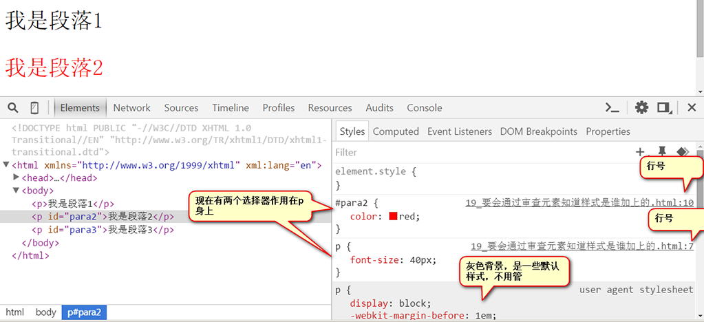 上面css中的div div p,也能使文字的颜色变红。通过浏览器的审查元素,我们可以看到 p元素的祖先列表:
