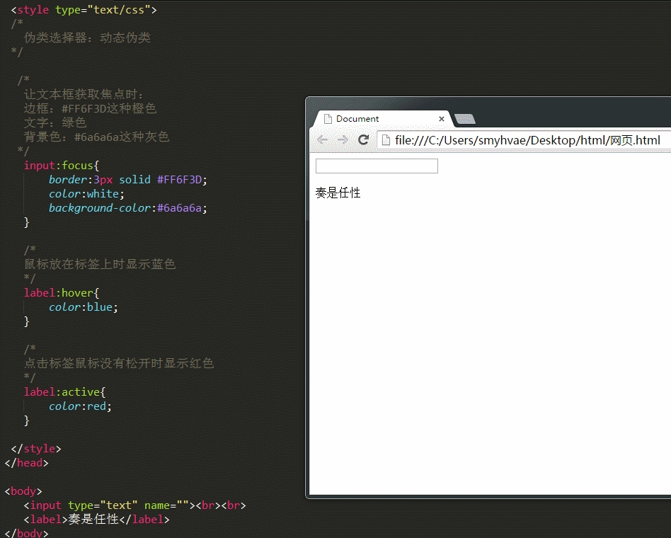 (2)动态伪类:针对所有标签都适用的样式。如下: