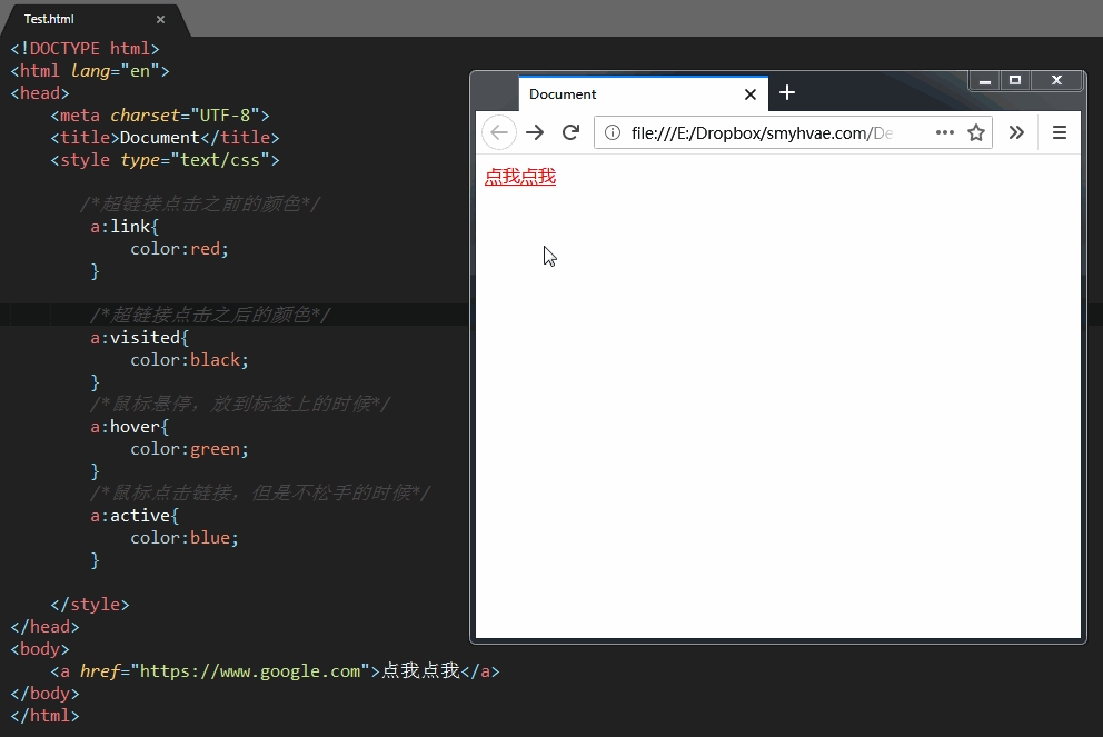:link“链接”:超链接点击之前:visited“访问过的”:链接被访问过之后:hover“悬停”:鼠标放到标签上的时候:active“激活”: 鼠标点击标签,但是不松手时。