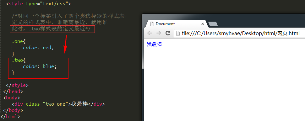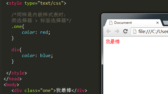 上图中,第二个样式比第一个样式的权重要大。因此在实战中可以实现这种效果:所有人当中,让某一个人为红,让其他所有人为蓝。