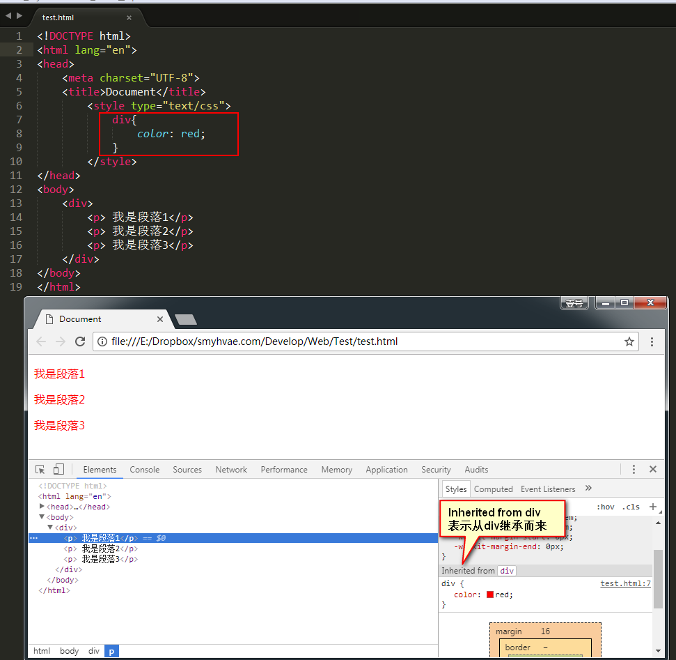 上方代码中,我们给div标签增加红色属性,却发现,div里的每一个子标签<p>也增加了红色属性。于是我们得到这样的结论:
