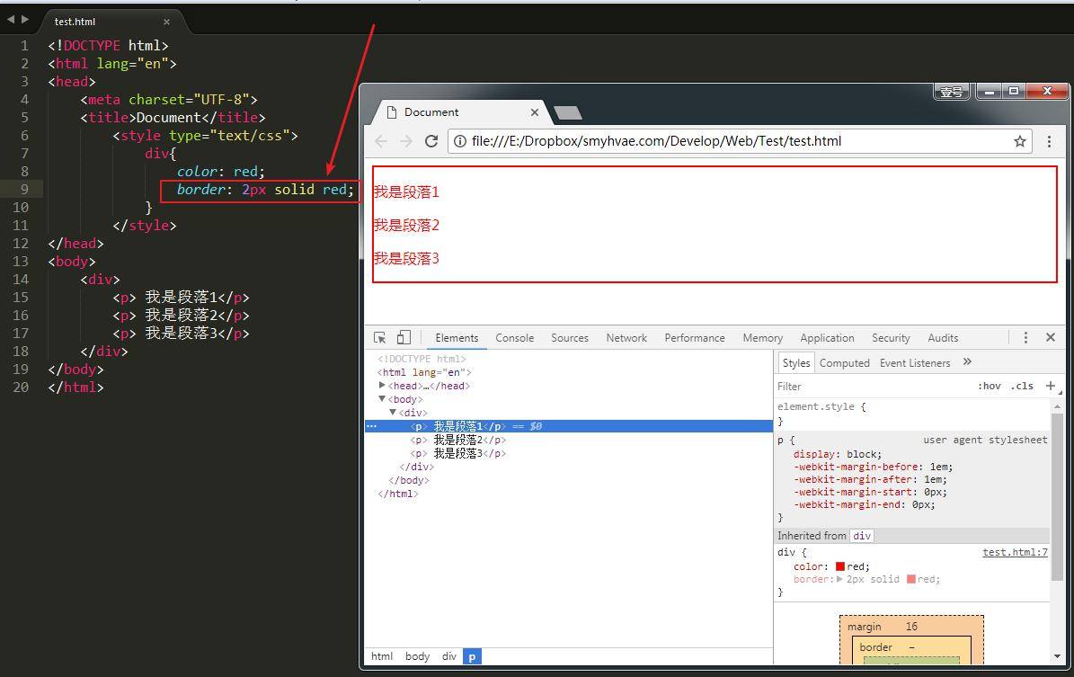 上图中,我们给div加了一个border,但是发现只有div具备了border属性,而p标签却没有border属性。于是我们可以得出结论: