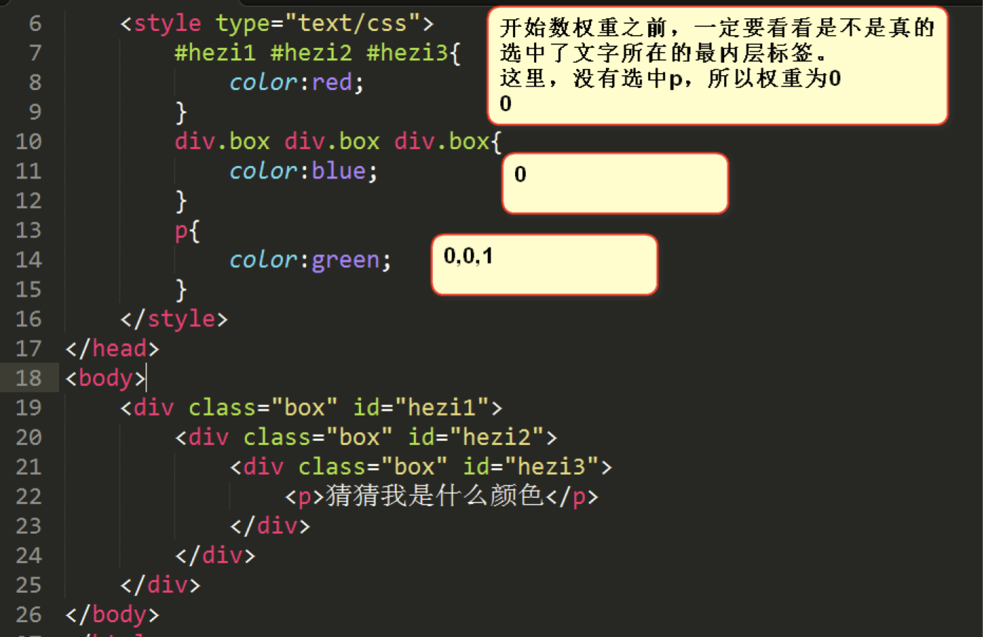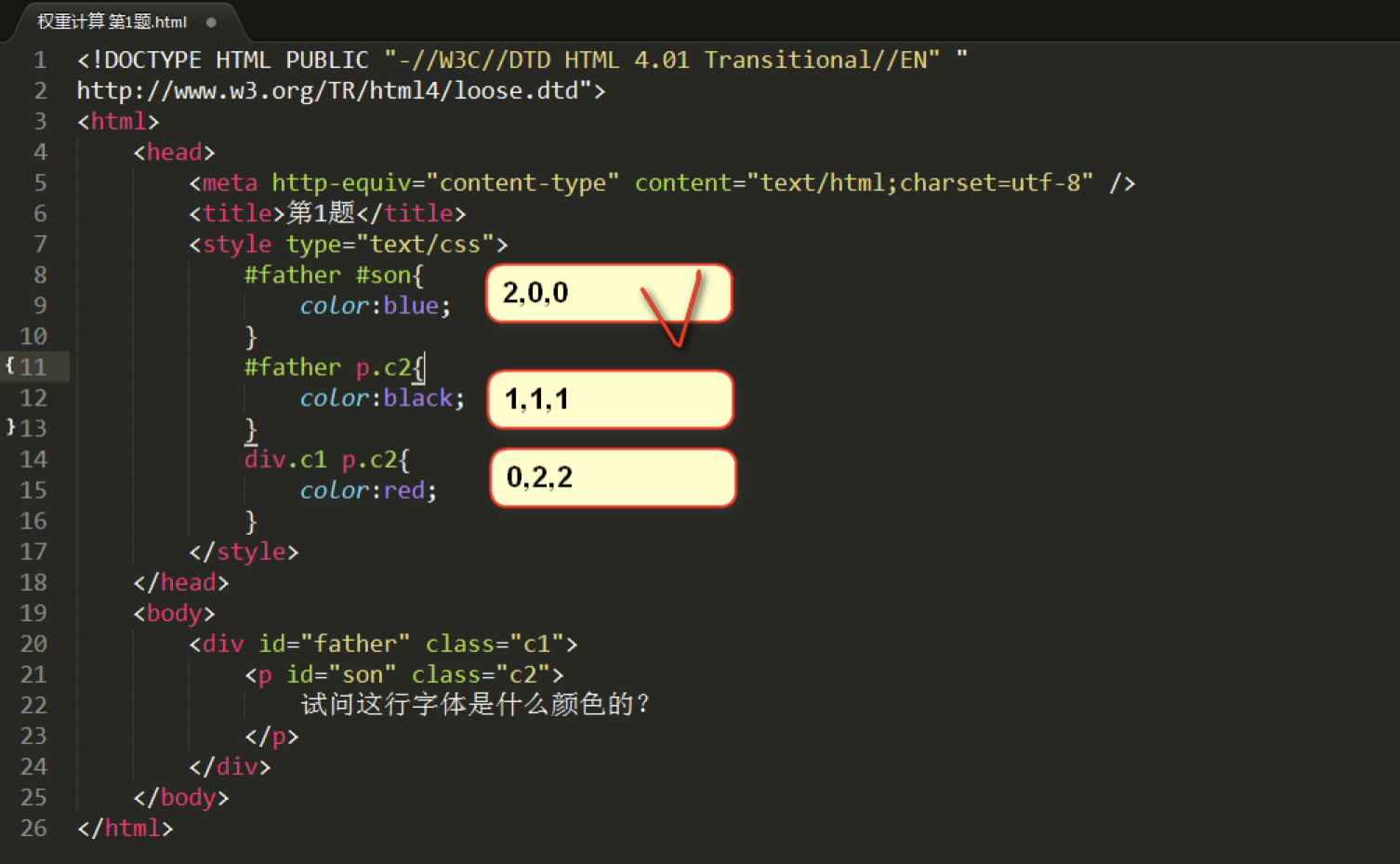 如上图所示,统计各个选择器的数量,优先级高的胜出。文字的颜色为红色。