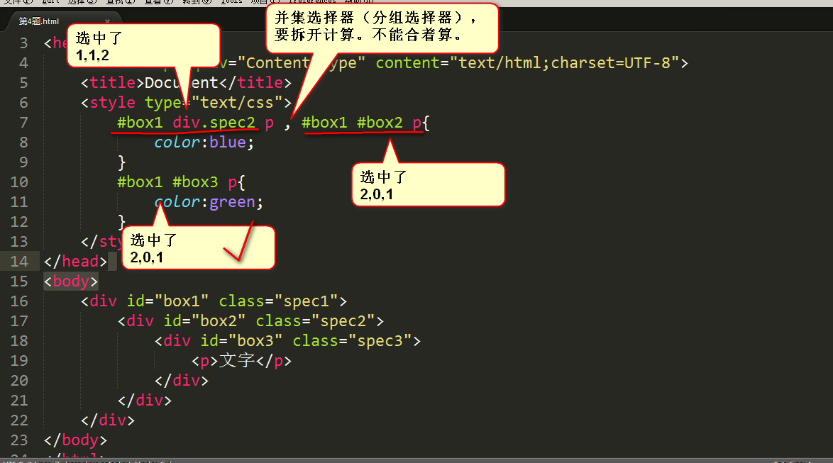 干不过p标签,因为p标签是实实在在选中了,所以字是蓝色的(以p为准)。
