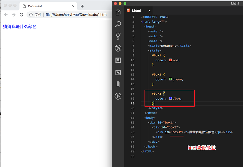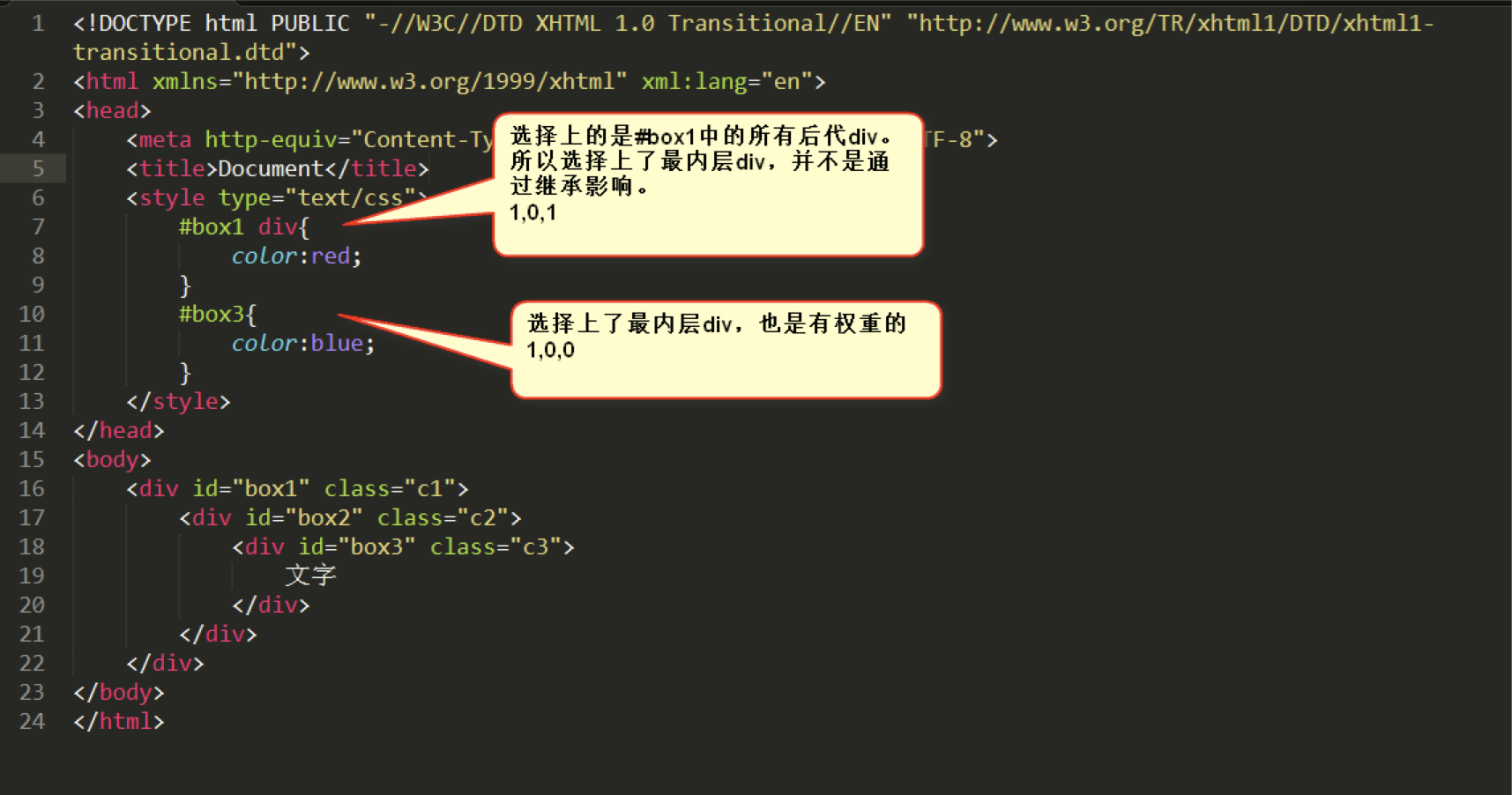 另外:如果大家的权重相同,那么就采用就近原则:谁描述的近,听谁的。举例如下:(box3 描述得最近,所以采用 box3 的属性)