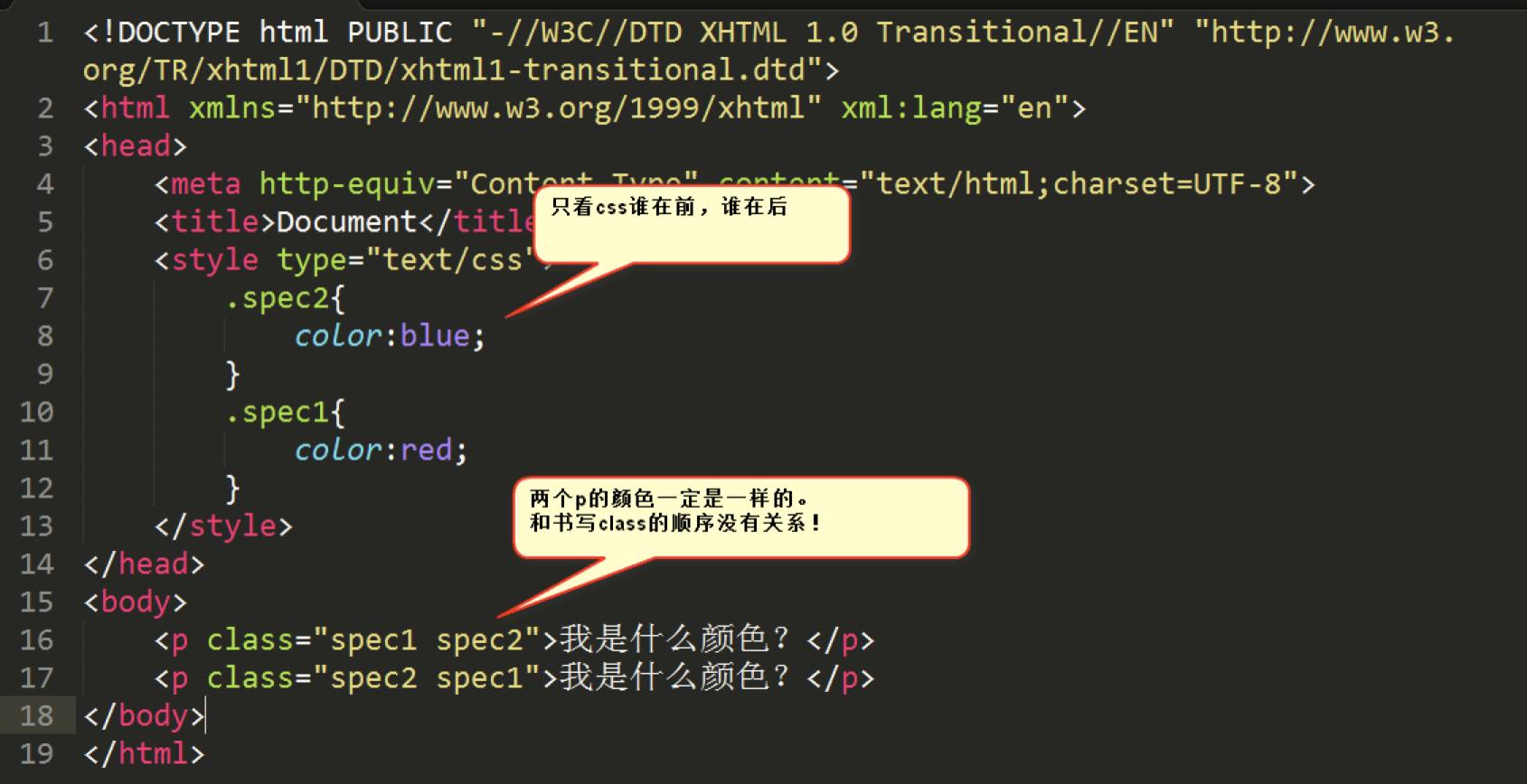 上图中,文字显示的颜色均为红色。因为这和在标签中的挂类名的书序无关,只和css的顺序有关。