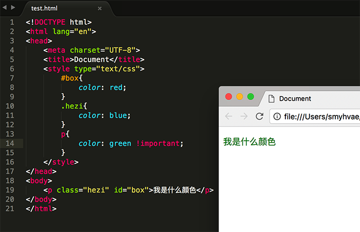 如果我们想让文字的颜色显示为绿色,只需要给标签选择器的加一个!important标记,此时其权重为无穷大。如下: