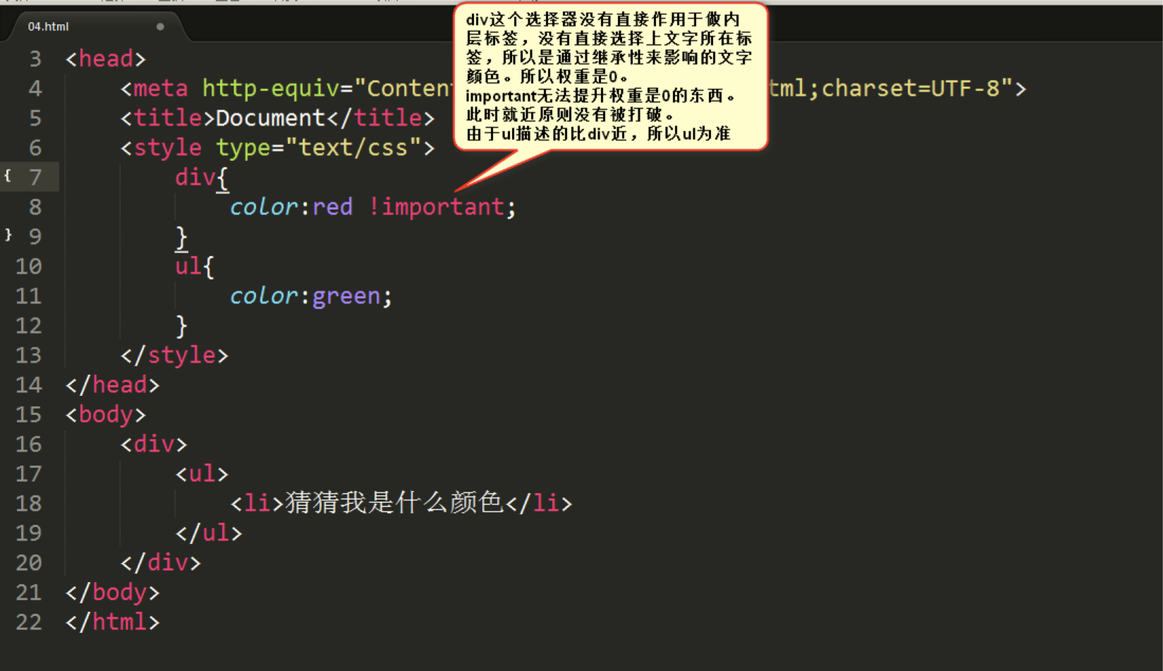 由于div是通过继承性来影响文字颜色的,所以!important无法提升它的权重,权重依然是0。