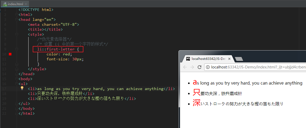 E::first-letter设置元素 E 里面的第一个字符的样式。E::first-line设置元素 E 里面的第一行的样式。E::selection设置元素 E 里面被鼠标选中的区域的样式(一般设置颜色和背景色)。