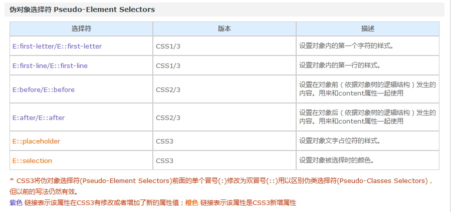 E:after、E:before在旧版本里是伪类,在 CSS3 这个新版本里是伪元素。新版本里,E:after、E:before会被自动识别为E::after、E::before,按伪元素来对待,这样做的目的是用来做兼容处理。