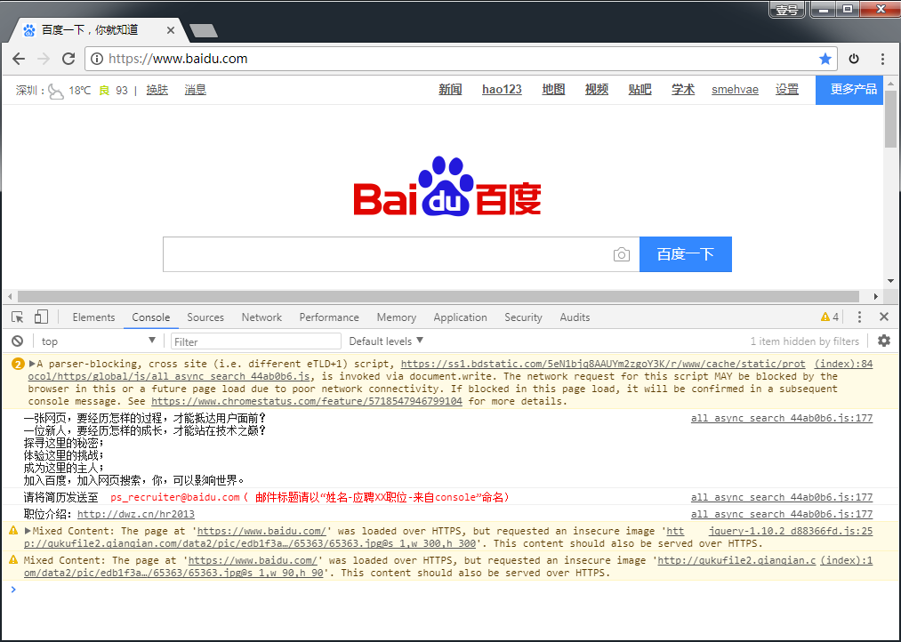 普通人是不会在意控制台的,但是有些网站另藏玄机。有个很有意思的地方是,百度首页的控制台,悄悄地放了一段招聘信息: