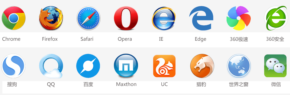 浏览器是网页运行的平台,常用的浏览器有谷歌(Chrome)、Safari、火狐(Firefox)、IE、Edge、Opera等。如下图所示: