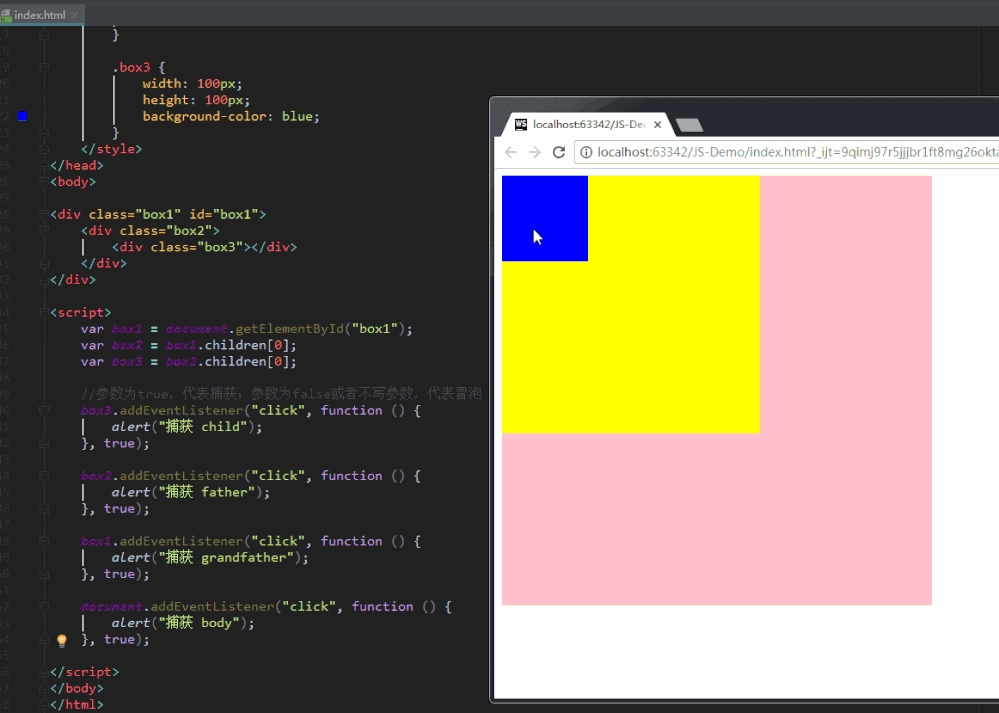 上图显示,当我点击子元素 box3 的时候,它的父元素box2、box1、body都依次被触发了。即使我改变代码的顺序,也不会影响效果的顺序。