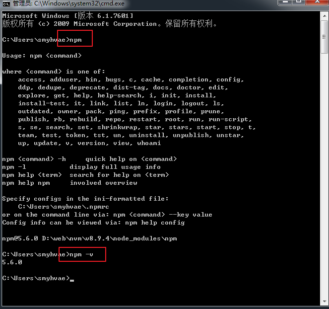 安装好 Node 之后,npm 也会自动安装的,输入 npm -v,查看 npm 的版本。