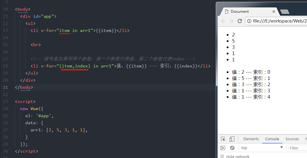 接下来,我们详细讲一下v-for的用法。需要声明的是,Vue 1.0的写法和Vue 2.0的写法是不一样的。本文全部采用Vue 2.0的写法。