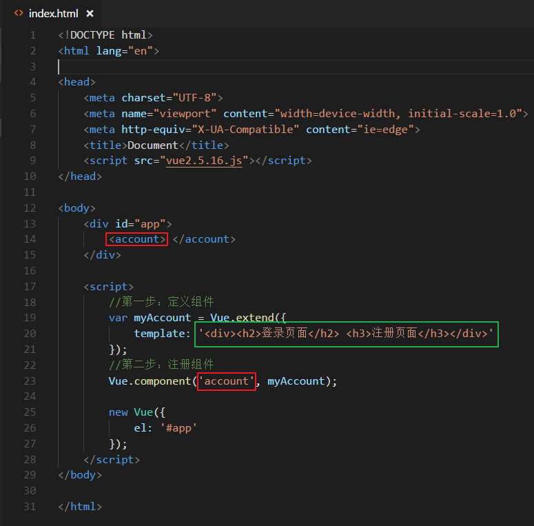 上方代码中,在注册组件时,第一个参数是标签名,第二个参数是组件的定义。