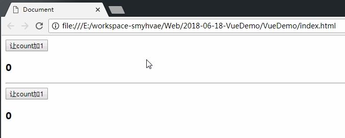 上面的例子中,将组件<counter>调用了两次,由于dataObj是全局对象,导致两个组件实例都可以共享这个dataObj数据。于是,我们点击任何一个组件实例的按钮,都可以让count数据加1。