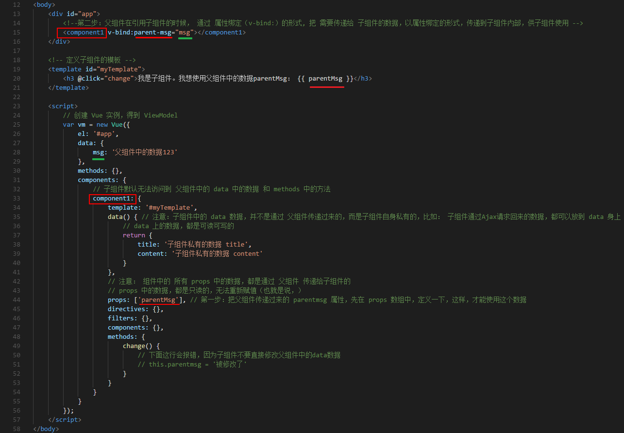 props: ['parentMsg'], // 第一步:把父组件传递过来的 parentMsg 属性,先在 props 数组中,定义一下,这样,才能使用这个数据